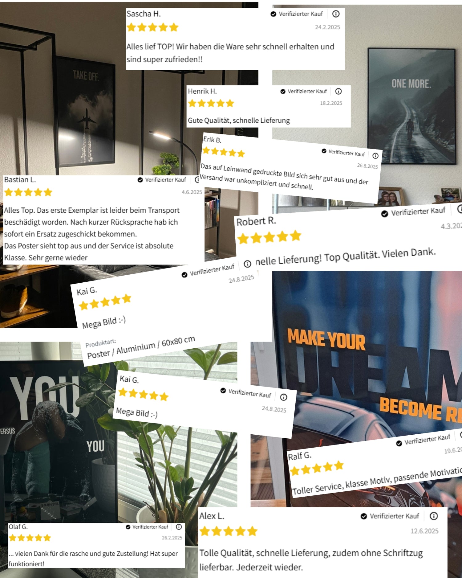 Unsere Community wächst stetig – und das aus gutem Grund. Mehr als 700 Kunden haben sich bereits für Canvart Studios entschieden und genießen täglich die Kombination aus hochwertiger Qualität, einzigartigen Designs und schneller, zuverlässiger Lieferung.